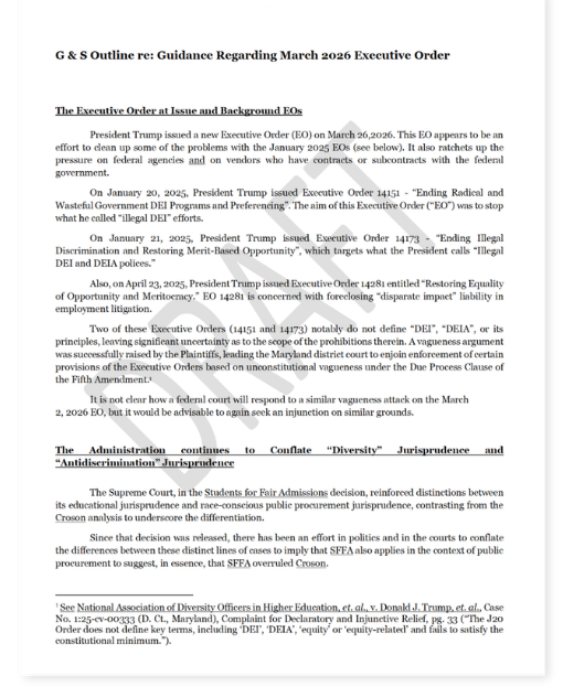 [8] The March 26, 2026 EO also notes that it continues to be “the policy of the United States to promote economy and efficiency in Federal contracting by preventing racial discrimination.” Meaning that anti-discrimination measures are still appropriate.